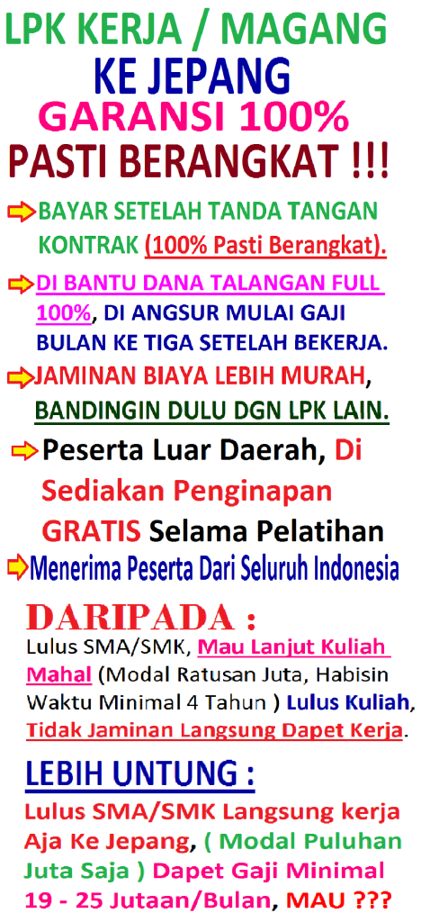 Demikian apa saja yang harus ditanyakan mengenai racikan-racikan yang telah diinformasikan di atas sebagai sarana prasarana dan syarat untuk mendaftar di LPK kerja magang ke Jepang terdekat di Purbalingga Jawa Tengah yang akan di backup penuh oleh LPK yang sudah so sending organization dengan pertaruhan legalitas yang sudah terpercaya bergaransi mendapatkan dana talangan full backup 100%.