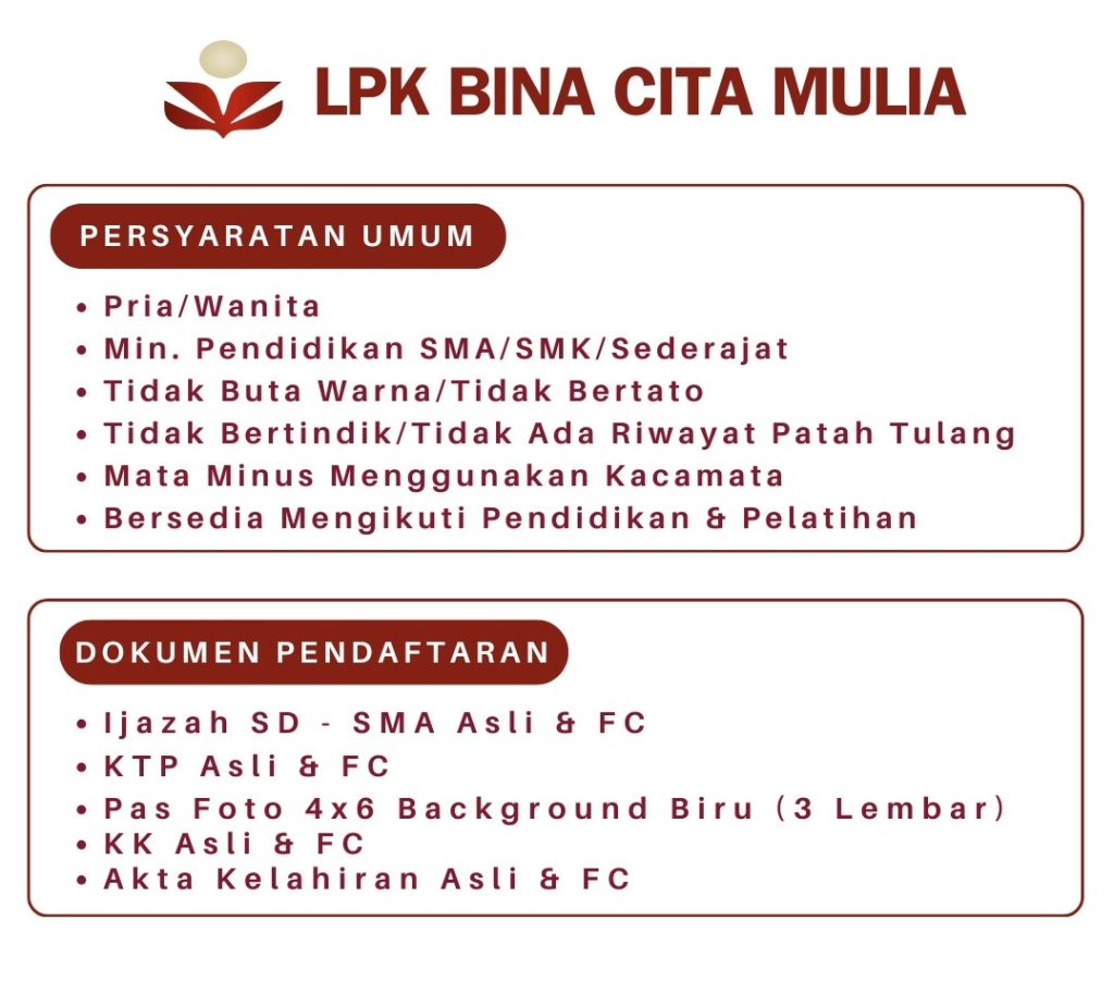 Untuk pendaftaran Maka Anda membutuhkan Sinergi badan sehat dan ijazah SMK atau SMA atau SMU yang sederajat dengan usia minimal dan maksimal 29 tahun untuk bisa mendaftar di LPK kerja magang ke Jepang terdekat di Purbalingga Jawa Tengah.