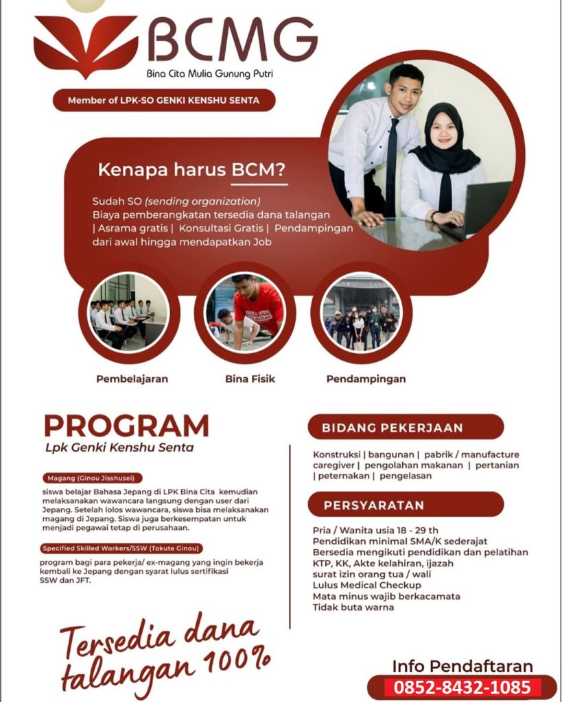 Untuk keberangkatan ke Jepang dalam rangka menjalani pekerjaan berupa magang, maka LPK magang ke Jepang terdekat Terbaik di Jawa Tengah area ini akan memberikan garansi pasti atas keberangkatan anda untuk berkarir ke negara Japan.